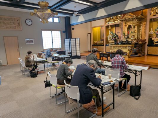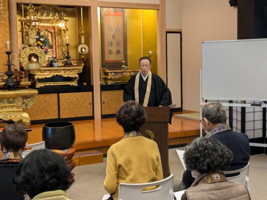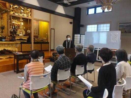 法話会では、はじめて仏教を聞く人に向けたテーマを設けて、前半は住職及び僧侶の法話を聴き、後半はお茶をいただきながら、テーマのことや仏事などの疑問に感じたことを出し合い共有する時間を設けております。