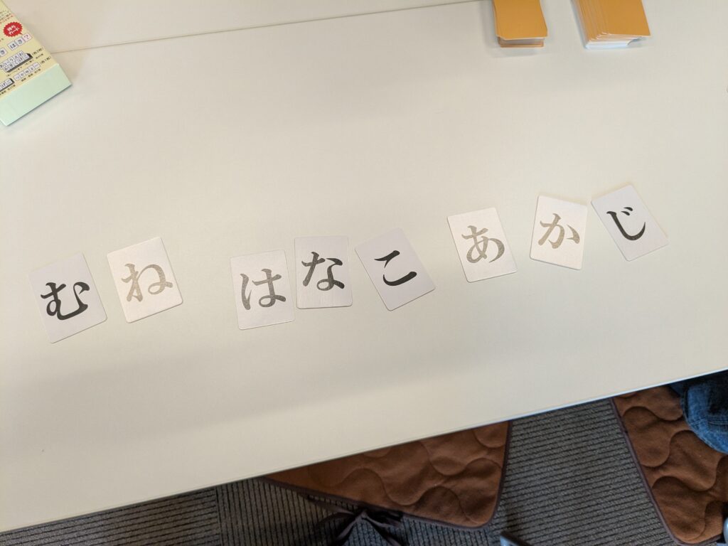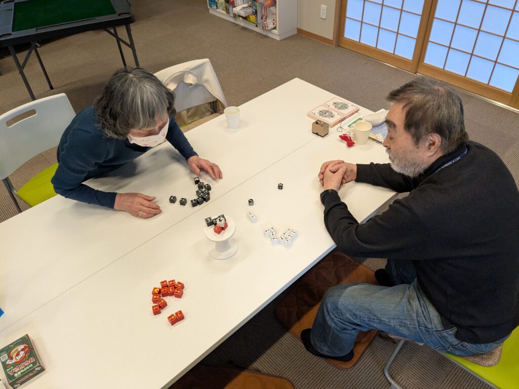 参加者2名と一緒に「ひらがなマージャン」と「バランスゲームDORAGURA」を楽しみました。どちらも簡単そうで頭と手先を使うゲームなので、ハマる人は嵌るかもしれません。